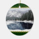 Winter landscape of a cabin reflection on a crystal blue lake with Bitteroot Mountains in background, Clark Fork, Idaho.