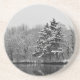 This coaster set features a black and white photograph depicting the beauty of evergreen trees by a lake on a snowy winter day. It transmits the peace and tranquillity that comes with a fresh blanket of snow and the fairyland it creates -- truly a Winter Wonderland! Looking closely, the viewer will note that the photo was taken as snow was falling (and falling), adding unique effects to this idyllic scene.