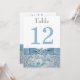 Continue the theme of your Christmas or winter wedding with this elegant double-sided 5"x7" ice blue, silver grey floral FAUX glitter damask pattern wedding reception table number card that has a background of assorted white snowflakes on it and a PRINTED steel blue ribbon and bow with a pair of diamond jewels and FAUX blue glitter joined hearts on it. It would be perfect for a winter wonderland theme or for a Christmas or New Year's Eve wedding. ***PLEASE NOTE there are no raised elements on this invitation. Everything is printed flat. It is shown here on basic paper, but could stand easily on its own with the premium triple thick paper. **You MUST change the number 12 to each of the table numbers you need, add it to your cart, and then return and repeat the process until you have all the individually numbered cards that you need in your cart. Stand it on a small easel, or in your centerpieces.***PLEASE NOTE that if you change the fonts or size of the fonts, it may alter how your card prints. It will print the way you see it on your monitor, so if you have alignment issues, or sizing problems, please contact me for help BEFORE you order. I will not see your card once you order it, and Zazzle will NOT edit anything (typos, alignment, etc.). If you require assistance or would like any other matching items, or a different colour combination, please email your request to niteowlstudio@gmail.com.