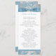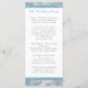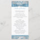 This elegant and festive 8.5"x11" fold-in-half wedding program with a silver grey and white background with white snowflakes and an ice blue floral damask pattern has a PRINTED steel blue ribbon and bow with a pair of diamond jewels and FAUX blue glitter joined hearts on it that matches the winter or Christmas wedding invitations shown below. All the text is customisable. Email niteowlstudio@gmail.com if you need any assistance with the customisation of this, or if you have any questions or requests.