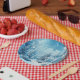 Pretty paper plates with an image of a beautiful, snow covered pine tree forest. A lovely Winter day with blue sky and falling snow.