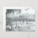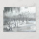 Trees reach into a misty, cloudy winter sky. Snow piles and swirls. Winter is beautiful. Original Chinese brush painting by Ren Adams reproduced here on a lightly textured, glossy finish postcard.
