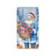 This design features a figure dressed in a blue Santa Claus outfit, holding a wicker basket full of red and white gift boxes. Additional gift boxes are placed on the snow-covered ground beside the figure. The background depicts a snowy landscape with tall, thin trees and falling snowflakes. The non-traditional blue attire for Santa adds a unique twist to the classic holiday scene, evoking feelings of warmth and generosity.
