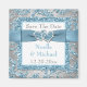 This ice blue, silver grey and white FAUX glitter floral damask pattern save the date wedding magnet has a blue PRINTED ribbon and bow with a pair of PRINTED FAUX glitter and diamond jewels joined hearts on it that matches the wedding invitations shown below. The text is customisable so you can change it to say "Thank You" and give it out as a wedding favour if you want to. If you require any other matching items in this design, please email your request to niteowlstudio@gmail.com.