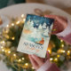 This card design is filled with colour and the joyous of a winter wonderland vintage vibe: White Christmas trees sants on a sled: elegant script, and serif typography.