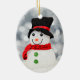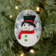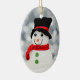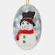 Ceramic ornament featuring a picture of a cute snowman in the snow.