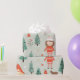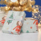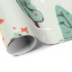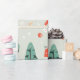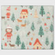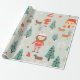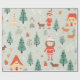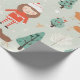 This image is a whimsical winter-themed pattern featuring stylised characters in warm clothing, friendly reindeer, cosy houses, and an assortment of trees under a light snowfall. The colour scheme uses a calm palette of greens, oranges, and creams to create a cheerful, yet soothing winter scene. The playful design is reminiscent of a storybook, ideal for children's textiles or seasonal decorations.