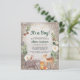 Budget-friendly rustic winter baby shower invitation with cute watercolors of woodland animals, florals, greenery and an overlay of gold stars and snowflakes. "It's a Boy!" or "It's a Girl!" and the mother-to-be's name are written in a hunter green script.