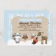 Winter woodland animals including a deer, racoon, fox, and owl. Whimsical style with all animals wearing winter hats and scarves on a burlap background, with snow, birch trees, and a soft blue colour. The "BABY SHOWER FOR" font in the banner at the top is NOT editable. All other text can be customised, and you can add additional text on the back or leave as the matching blue.