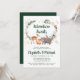 Cute rustic winter-themed couples baby shower invitation featuring watercolor illustrations of woodland animals, florals, greenery and gold stars and snowflakes. "Adventure Awaits" and the names of the mother-to-be and father-to-be are written in a forest green script.