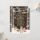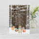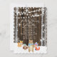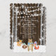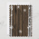 Rustic winter scene with dark brown wood grain background, elegant, modern and winter wonderland baby shower party theme featuring snowflakes, snow, string lights, animals and birch trees. Perfect for winter celebrations & baby showers. Personalise with your party information all text is fully customisable.