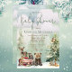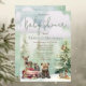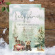 Winter woodland scene "Baby Shower" design. Features an evergreen fir tree and a felled log with mushrooms growing and snow on the ground with a cute little baby deer, bear, racoon, owl, bunny and chipmunk. In the background you can just make out the silhouettes of more evergreen trees, some snow and snow clouds. Perfect for your winter-themed Baby Shower or Sprinkle.