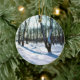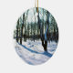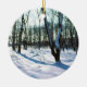 This round ornament features an image of a beautiful snowy winter woods. The image continues on the back side, resulting in the impression of seeing the full image when the ornament turns.