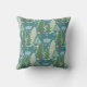 A colourful winter woods with red fox patterned throw pillow with a pretty teal blue sky, snowflakes, clouds, evergreen trees covered with snow, and little red foxes!