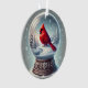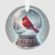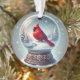 A vibrant red cardinal perched inside an ornate snow globe, surrounded by a frosty winter landscape with snowy trees and delicate snowflakes.