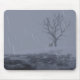 A cold and windy 3D landscape in winter, created in Vue. On top of a hill white with ice and snow, against a stormy grey sky with rain or sleet falling steadily, a lone, bare maple tree stands with a wooden bench under it.