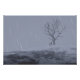 A cold and windy 3D landscape in winter, created in Vue. On top of a hill white with ice and snow, against a stormy grey sky with rain or sleet falling steadily, a lone, bare maple tree stands with a wooden bench under it.