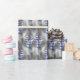 A winter holiday design of an outdoor lighted Christmas tree decorated with blue ball ornaments. A snowy winter sparsely decorated Christmas tree scene in shimmery blue and white.