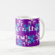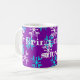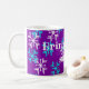 This mug has a wintry message with blue and white snowflakes on a purple background. Great for winter coffee, tea, or hot cocoa.