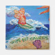 The painting was made for a group fundraising for the American Cancer Society's "Relay for Life". The booth theme was luau of "Wipe Out Cancer". The painting shows a glimmering orange surfing angel on a blue ocean with a sparkling sun. Sea foam washes up on the sand surrounding the words "Wipe Out Cancer". There is a pink sea shell on the beach. The painting was rendered in acrylic and sprinkled with glitter for texture and shine. The image was converted into cards that the team could use for the luminarias.