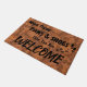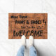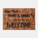 This fun doormat says "Wipe Those Paws And Shoes!! Then You Are WELCOME" The exclamation marks are really tiny shoeprints, added for a little whimsy. Four tiny pawprints add a touch of cuteness. The background features a faux wood parquet pattern (photo print).