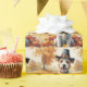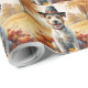 A watercolor-style painting of a cheerful dog sitting amidst a pile of vibrant fall leaves, surrounded by tiny pumpkins and scattered acorns. The dog wears a little pilgrim hat and beams with joy, capturing the spirit of Thanksgiving. In the background, soft harvest fields and golden-hued trees create a peaceful countryside ambiance. Gentle textures and warm, muted autumn tones give the scene a cosy, nostalgic feel perfect for celebrating the beauty of the season.
