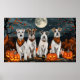 Unleash the spooky spirit with this eerie Halloween design featuring a pack of dogs under a dark, moonlit sky, surrounded by flying bats and glowing pumpkins. Perfect for those who love a touch of frightful fun with their furry friends!