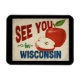 A charming Wisconsin vintage travel wall refrigerator magnet featuring a lovely red apple, along with fun retro style text that says, "See you in Wisconsin"