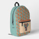 This backpack design features a wise and colourful elephant with flaring ears that are stylised with a turquoise, orange, and yellow design, almost like embroidery (although it's just regular printing). The elephant is on the pocket against a light golden peach background, with darker peach accents. The top and the rest of the front feature a golden and orange floral pattern, set against turquoise with turquoise sides and top. This design has a southeastern Asia feel, with beautiful vintage colours. Your initials appear on the left side - type your initials or delete the placeholder if you don't want initials.