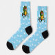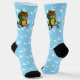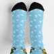 A Wise Old Owl Sitting On A Branch is based on an illustration I did. It is an acrylic painting, on watercolor paper. The background design is pale blue with a white, silhouette leaf pattern. The owl, which appears on both sides of each sock, is the bright green and yellow. This wise bird is perched on top a brown tree branch with green leaves