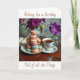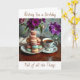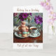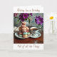 A sweet birthday card with an illustration of a Macaron cookies, a vintage cup of coffee and a vase or pretty purple flowers. A beautiful birthday card for any woman.