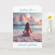 Beautiful woman meditating on a beach of white sand and shiny sea glass. Wishing a friend or family member a peaceful birthday full of love, light and serenity.