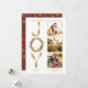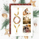 Wishing You Peace, Love and "Joy" Christmas Holiday faux foil gold-toned design featuring a wreath overlaid on the "O" in "Joy" on the left with three photos of your choosing on the right. Simply add the year and your family name to complete the design. The back features a repeat pattern of holiday greenery and berries. Front has a white background. Also available in real gold foil in our shop.