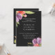 Delicate violet and red watercolor floral arrangements on slate black background, wedding invitation. Customise text, font style, colour and size.
