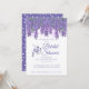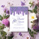 Gather under the wisteria vines in spring for a beautiful garden, bridal shower. An adorable, multidimensional edge of violet purple wisteria vines at top. A cute watercolor bicycle graphic at left, near the centre, customisable text. On reverse is a white frame for the registry info on a purple background with white spots.