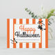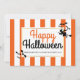 Witch and bats stripes elegant Halloween flat card. The focus of this modern Halloween card is a black witch silhouette and bats and an orange and white striped pattern border. Your wording is placed in a white frame with gold outline.