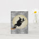 Silhouette of witch on a broomstick with fire coming out of the broom and a black cat perched on the handle against a round full moon.