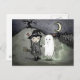 A cute Halloween image. A little witch and ghost hold hands against a dark background of a glowing moon, scary tree and spooky cemetery. little red love-hearts above their heads.