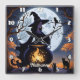 A mysterious witch stirs her cauldron under a full moon, accompanied by black cats, as autumn leaves swirl in the air, creating a magical Halloween atmosphere.