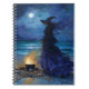 Enchanting witch stands by a glowing cauldron under the moonlit ocean sky.