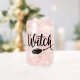 This black-and-white design features the word "Witch" in a bold, flowing script font, with the tail end of the letter "h" transforming into the handle of a broomstick. The text is stylised with a playful, handwritten look, adding a whimsical touch to the overall theme. Surrounding the word are scattered stars, creating a magical, starry-night effect that enhances the witchy theme. The broomstick, positioned diagonally under the text, adds a dynamic element to the design, suggesting movement and adding depth.
