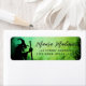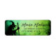 Return address labels featuring a black silhouette of an old witch stirring a bubbling, boiling cauldron on a black and green background, and customisable template fields for your name and address.