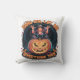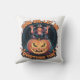 Witch conjuring thoughts by a glowing pumpkin cushion