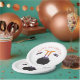 These cute Halloween paper plates feature orange booted witch's feet with blue and black striped stockings sticking upside down from a black cauldron. Little black bats with purple wings fly at each side. The orange text says "Happy Halloween" in a semi circle. The image is placed on a white background. Cute, especially for kids, or for any Halloween celebration. Graphics by Prettygrafik Design, © Prettygrafik.com