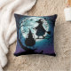 A mysterious witch soars through the night sky on her broomstick, silhouetted against a glowing full moon, while a black cat watches from the shadows.