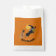 Fun party paper favour bags featuring a colourful original illustration of a witch flying past a full moon on a broom with a black cat and a Jack-o'-Lantern. Lots of Halloween party fun! Orange background.
