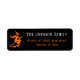 Custom, personalised, chic, fun, spooky, flying witch on broom halloween orange black and white, family name party invitations mail return address label. Simply enter your name / family name / company name, and address, to personalise. Perfect for both, home and business, adults and kids, personal and official mailings. Great return address labels for use on mailings for scary spooky zombie haunted halloween theme birthday party, office party, wedding, baby shower, and more.