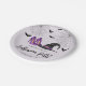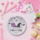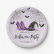 Make your Halloween celebration stylish and fun with these festive paper plates. The design features a witch hat, high heels, flying bat silhouettes and spiderwebs, all set against a light lilac background for a playful, feminine touch.
