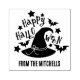 Personalised Halloween stamp for your Halloween gifts and Halloween favours with Happy Halloween from your family written beneath a witch hat surrounded by bats and stars.
