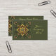 A business card template with a kaleidoscope pattern of the yellow and red flowers of Witch hazel, on a dark green background, perhaps for a herbalist or homaeopathy practitioner. With a template for your name on the front and other details on the back.